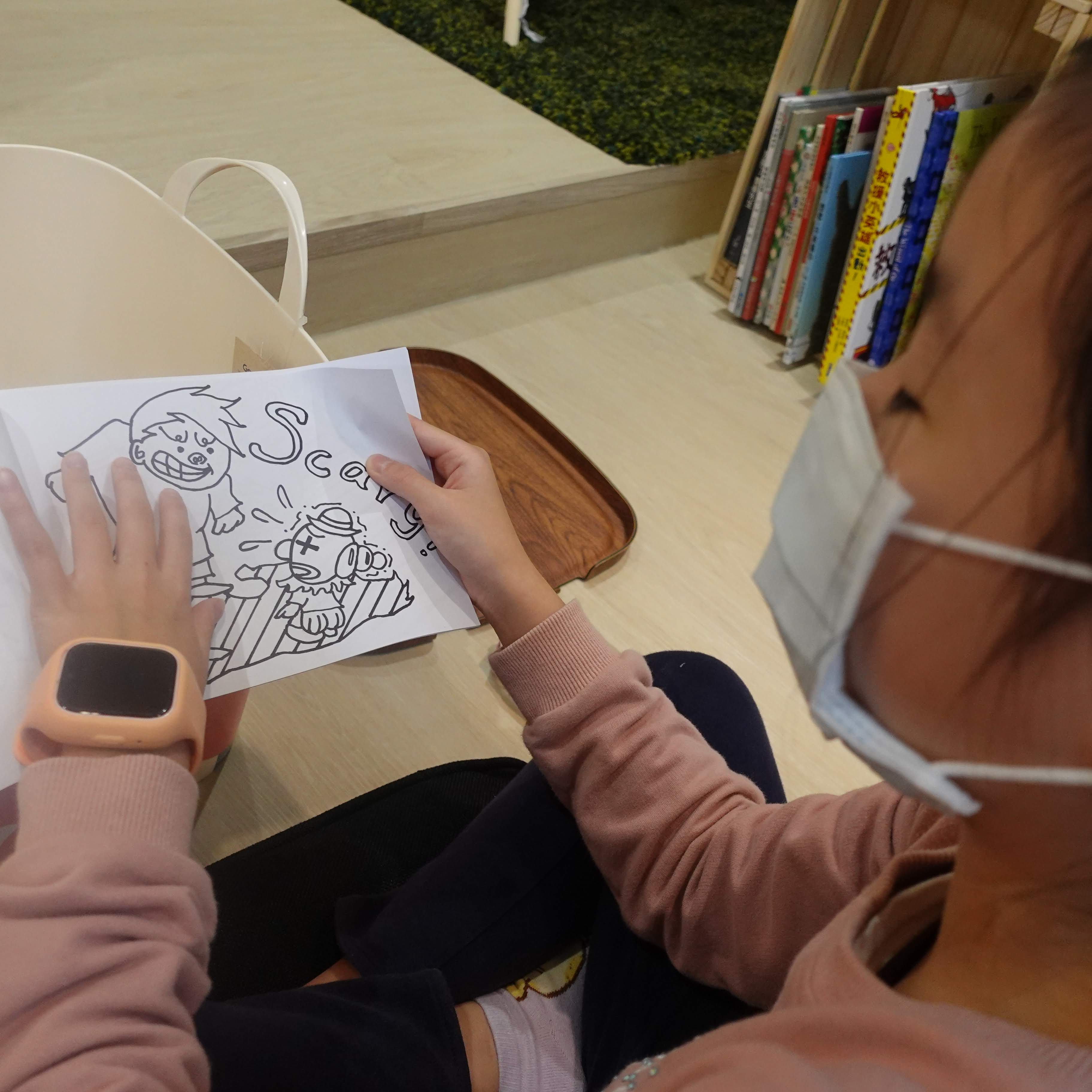 實體課程與線上故事哲學課並行,實體課有打基礎的心智圖系列課和主題活動課;在線上進行說故事、和孩子們討論故事已經三年,累積了100個故事,其中包含史達柯頓《美女還是老虎》、彼得布朗《荒野機器人》、卡夫卡《變形記》、柯南道爾《名偵探福爾摩斯系列》和梅爾維爾的《抄寫員巴托比》等作品,由長短篇故事或電影改編,20分鐘的故事時間加上10-20分鐘的現場討論。從聽故事開始,軟性接觸哲學大哉問。
