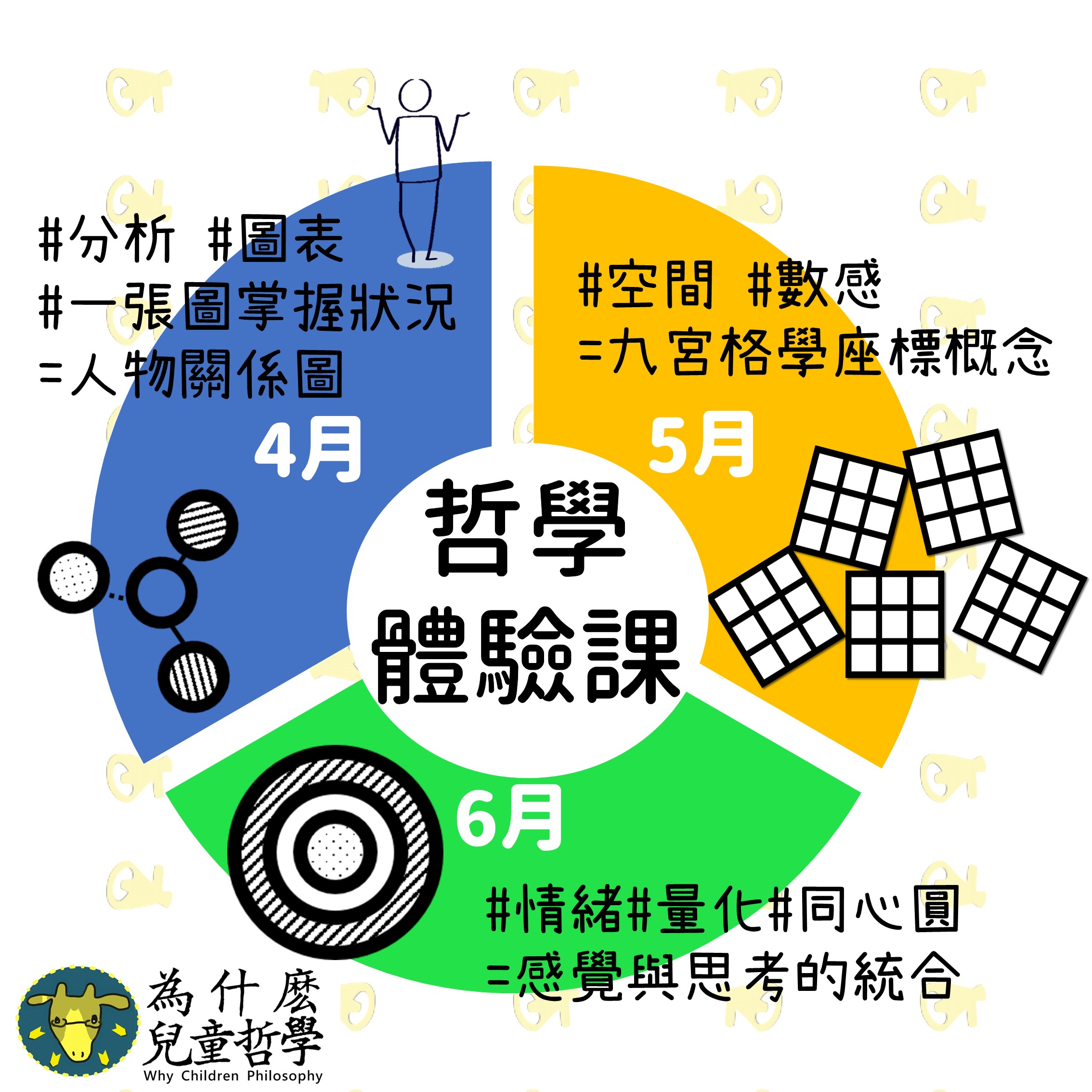 月_感覺與思考的統合:有那種經驗嗎?感覺很差但是沒有辦法表達出來,只能生氣流淚卻無法傳達給對方知道,除了慢慢增加辭彙讓自己更能表達自己的意思外,為什麼兒童哲學結合科學的量化方式,讓孩子透過同心圓如同標靶的視覺意象,知道自己的情緒在哪個「數字」、落在強中弱哪個程度,在腦中有清晰圖像後思考幫助感覺,讓下一次情緒來時,可以清楚傳達給爸媽:「我現在好像是30分的緊張程度,我知道怎麼處理,不用擔心我!」