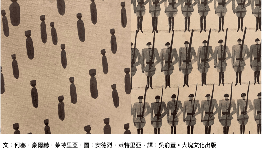 詩人用短短的17句詩道盡了戰爭的恐怖,一句一句疊加並呈現戰爭的樣貌。畫面不血腥,卻每翻一頁更加深戰爭的無情,展現戰爭蔓延的恐懼。另外在畫面上可見許多頁都有重複、疊加、密密麻麻的感覺,這種密集感讓人感到不適與害怕,就如詩人所言:「戰爭逼出恐懼的所有形狀」。孩子可從繪本的顏色就能體會,這本書並不歡樂,讓人感到悲傷,我想這也是繪者的用意,一方面寫實地表現戰爭的可怕,另一方面也提醒孩子,戰爭是灰暗的,蒙蔽的,戰爭不聽、不看、不去感覺。