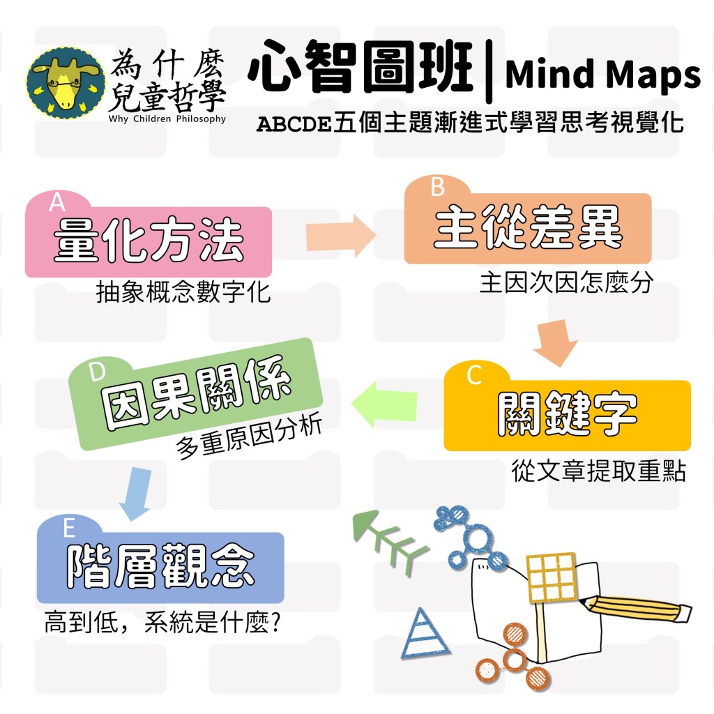 - 從故事情境中「收集資訊」,找出優先順序。孩子們天生的好奇心讓他們喜歡聽故事,除了享受故事帶來的情感體驗外,思考工具要如何幫助自己加深對一個故事的理解力呢?首先我們從收集資訊找出故事結構開始,讓不同的孩子能在同一個故事裡找到屬於自己的的解釋方式,練習對事物有「自己的想法」。學習畫出流程圖,並分析發生原因的占比。從複雜糾葛的故事裡抽絲剝繭,找出幾個原因後,經過和同學之間的討論推敲出最有可能的主因,藉此了解「關鍵事件」對結果如何起決定性的影響力。